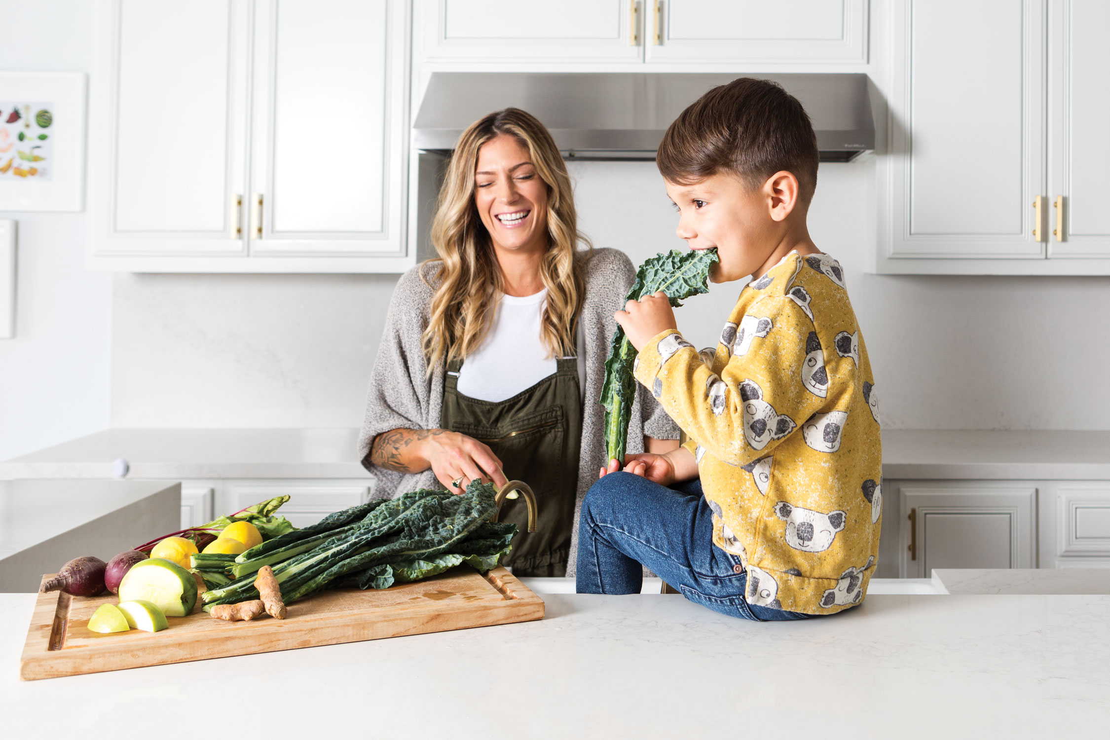 - Get kids involved in the prep and cooking process—safely. “When he feels like he’s had a part in making it, Sebastian’s much more eager to drink it,” says Lang Romero of green juices (kale, cucumber, celery, lemon and ginger or turmeric) he loves helping make. “We told him it makes him strong, so he drinks it and flexes his muscles.”