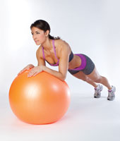- With your feet on the floor, place your elbows on a Swiss ball, keeping your shoulders over your elbows. You are now in a plank position.