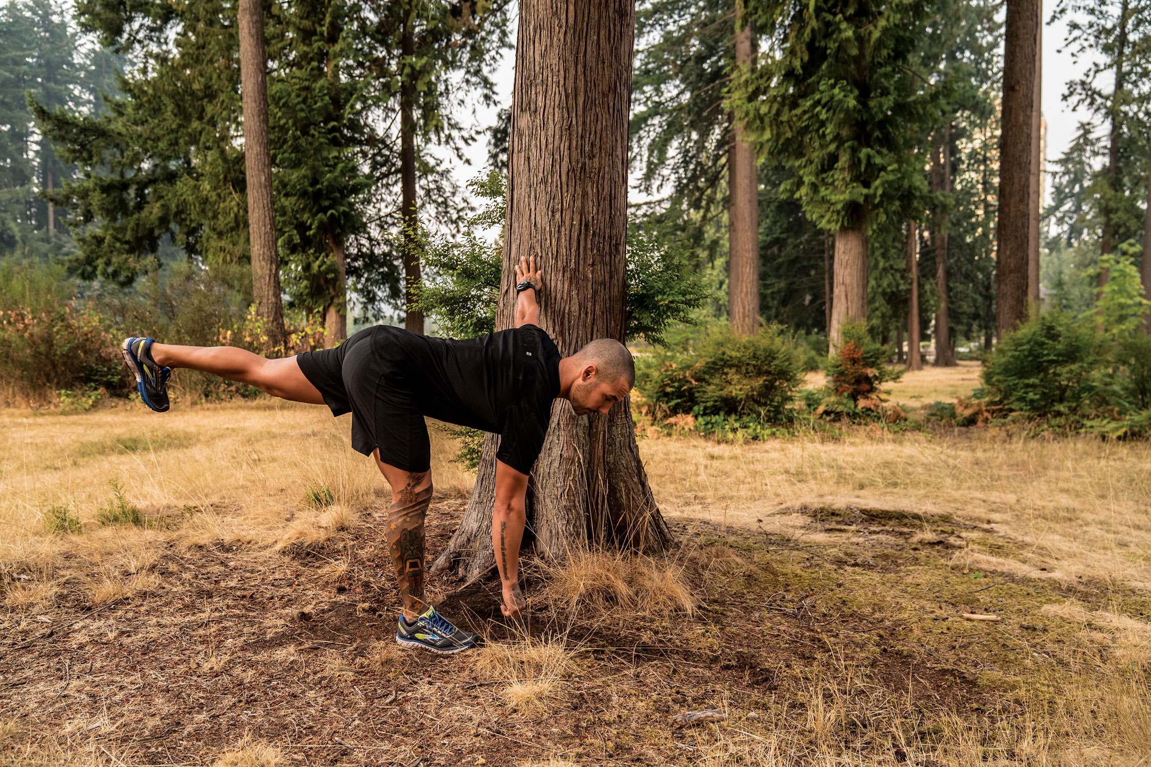 - Find a solid object to hold on to at about waist height that won’t move, such as a sign pole, a bike rack, or the back of a couch. Stand roughly three-quarters of your arm’s length away, and hold on with your left hand.