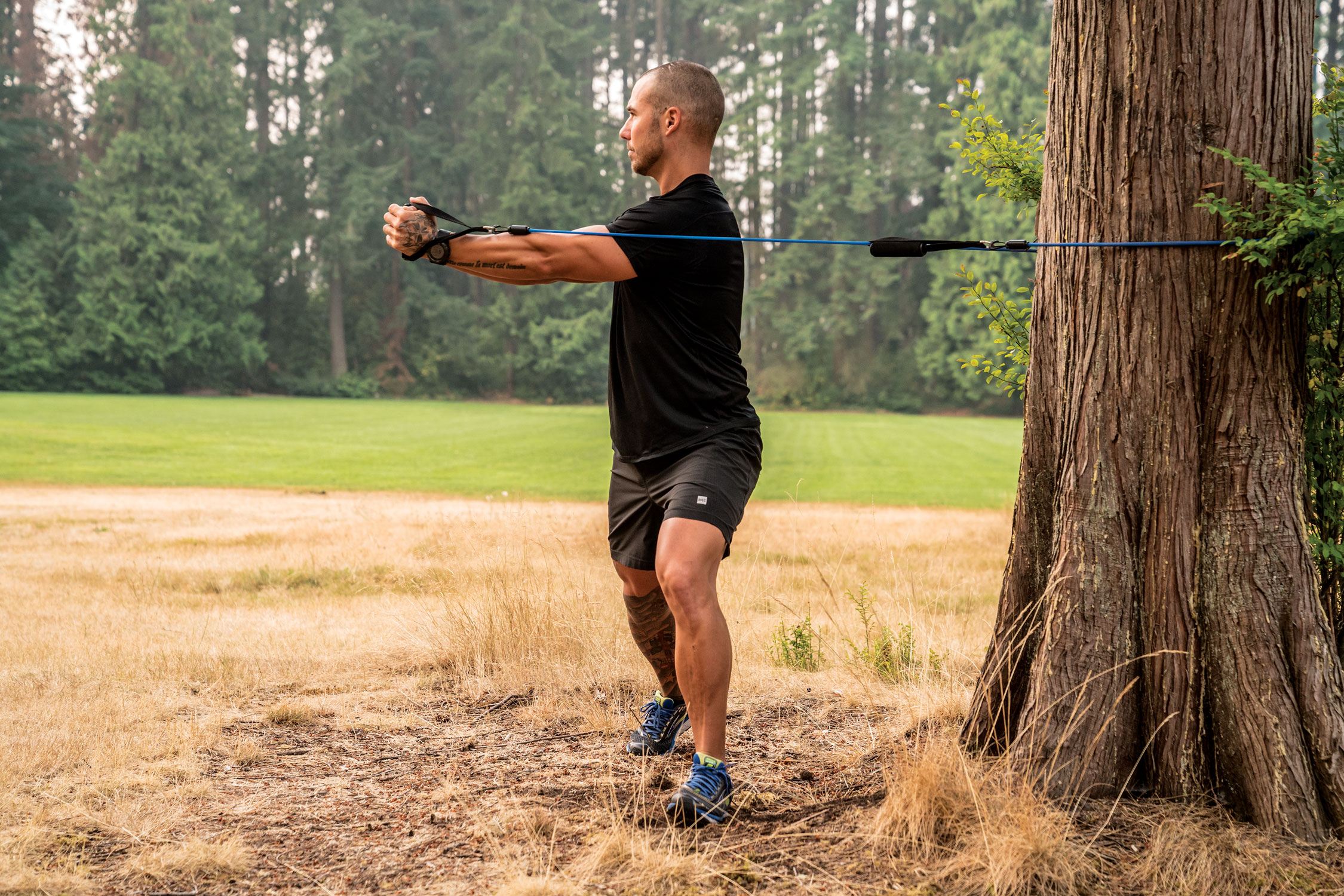 - Begin by fastening your resistance band at shoulder height to an object that will not move. Situate yourself so that you’re perpendicular to the band, with your inside leg forward and bent, and your outside leg back and straight (on your toe, like a high lunge).