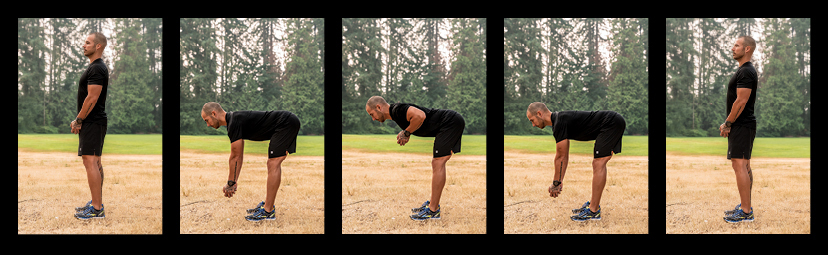 - Hinge forward at the hips and allow your arms and the weight to freely float forward underneath you, with minimal knee bend, until the tension in your legs and maybe lower back don’t allow you to bend any further down.