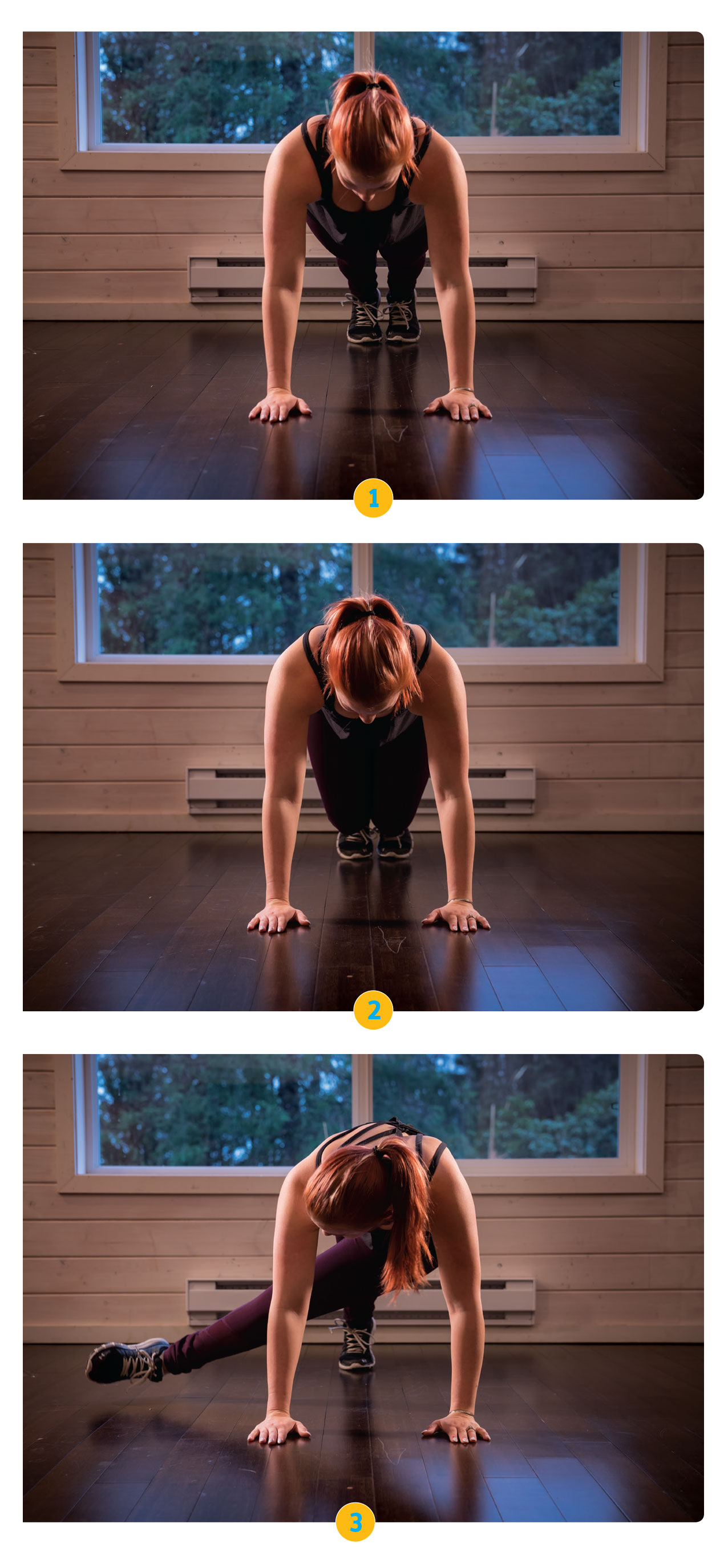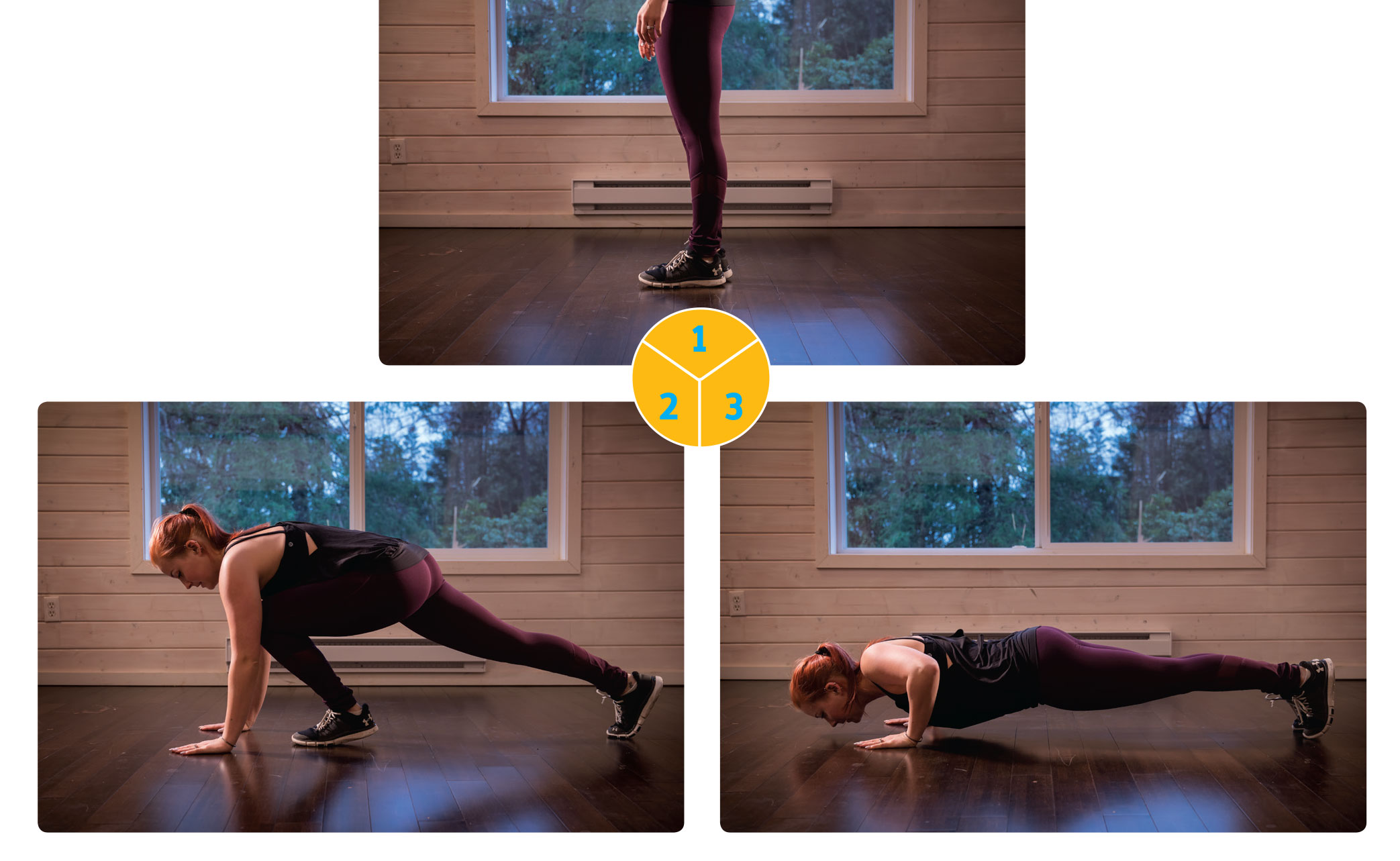 The Step-Up Push-Up will get your heart beating in a hurry. It incorporates a lunge, push-up, and mountain climber, targeting your lower body, the front side of your upper body, and your abs!