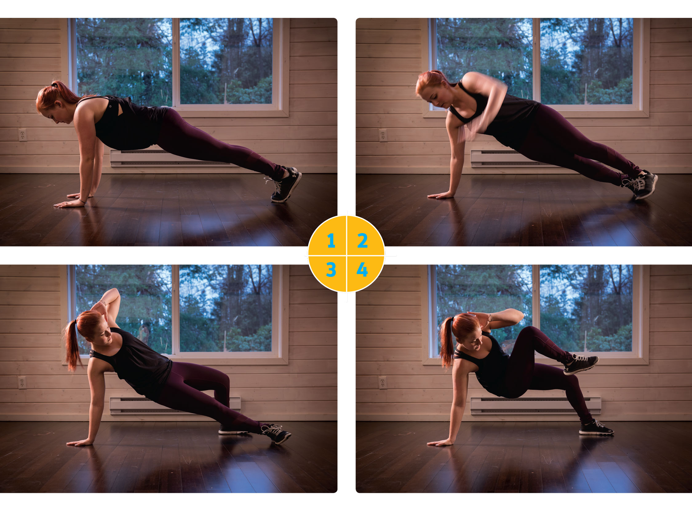 Muscles worked: obliques (side abs), abdominals, shoulders, triceps, quads, hamstrings, glutes