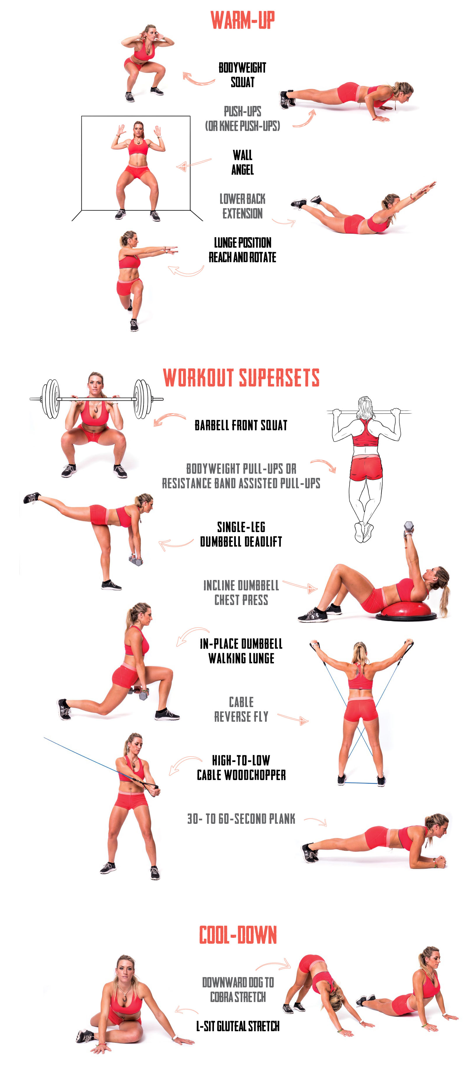 This workout is performed by super-setting one exercise with the exercise listed below it, with minimal rest between exercises. Perform two sets of each exercise for 10 repetitions.