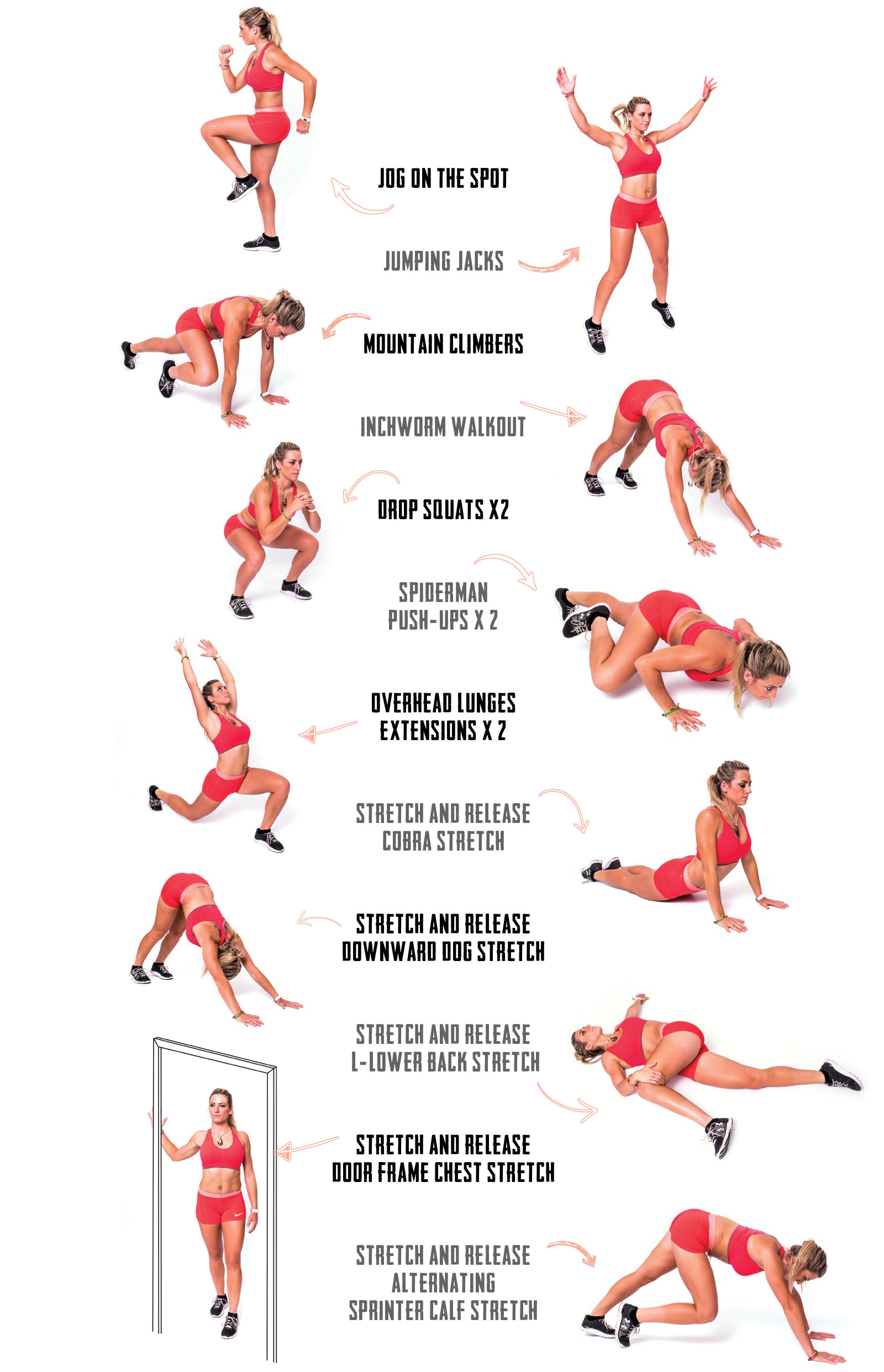 Do 12 reps per exercise (for warm-up, circuit, and cool-down) in a controlled manner. Perform three rounds of the workout circuit. Perform the warm-up and cool-down just once.
