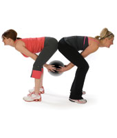 - Bend through the hips, maintaining a neutral spine, and get your partner to pass the ball back to you between the knees.