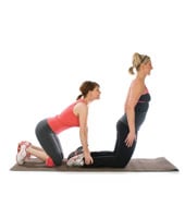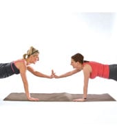 - While keeping backs flat, in a straight line from head to heels, tilt your pelvises and contract your abdominals to prevent your rear ends from sticking up in the air.