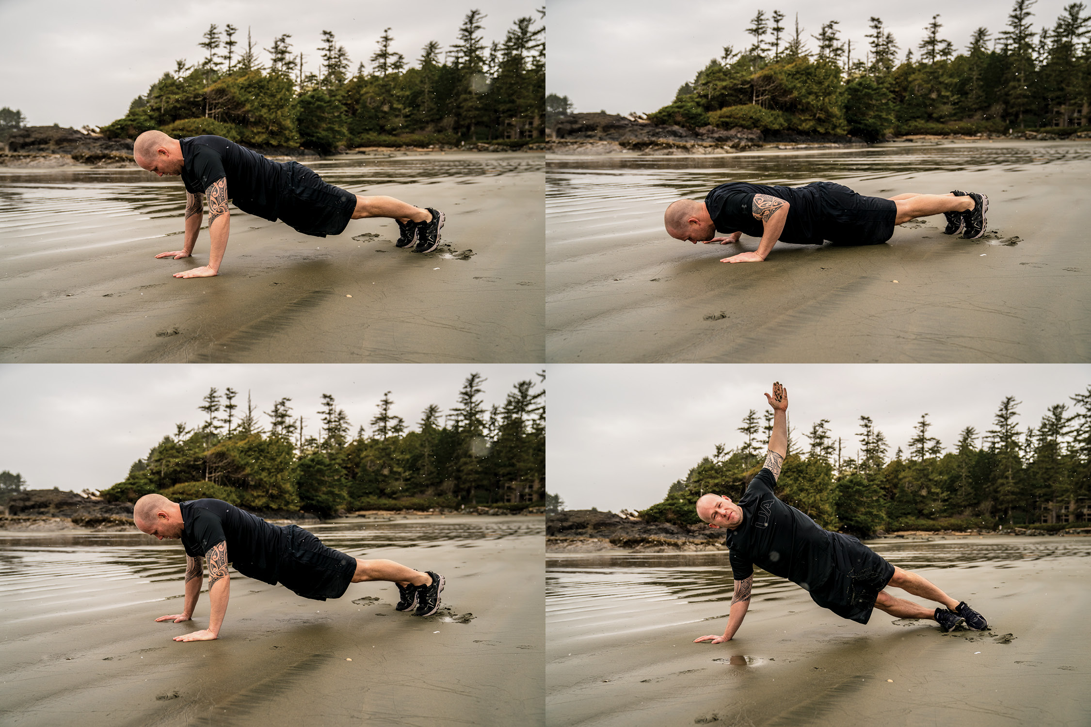 • Rotate your body back to the start position, perform another push-up, then repeat the side plank with your right arm reaching up. Keep alternating sides for the remainder of your set.