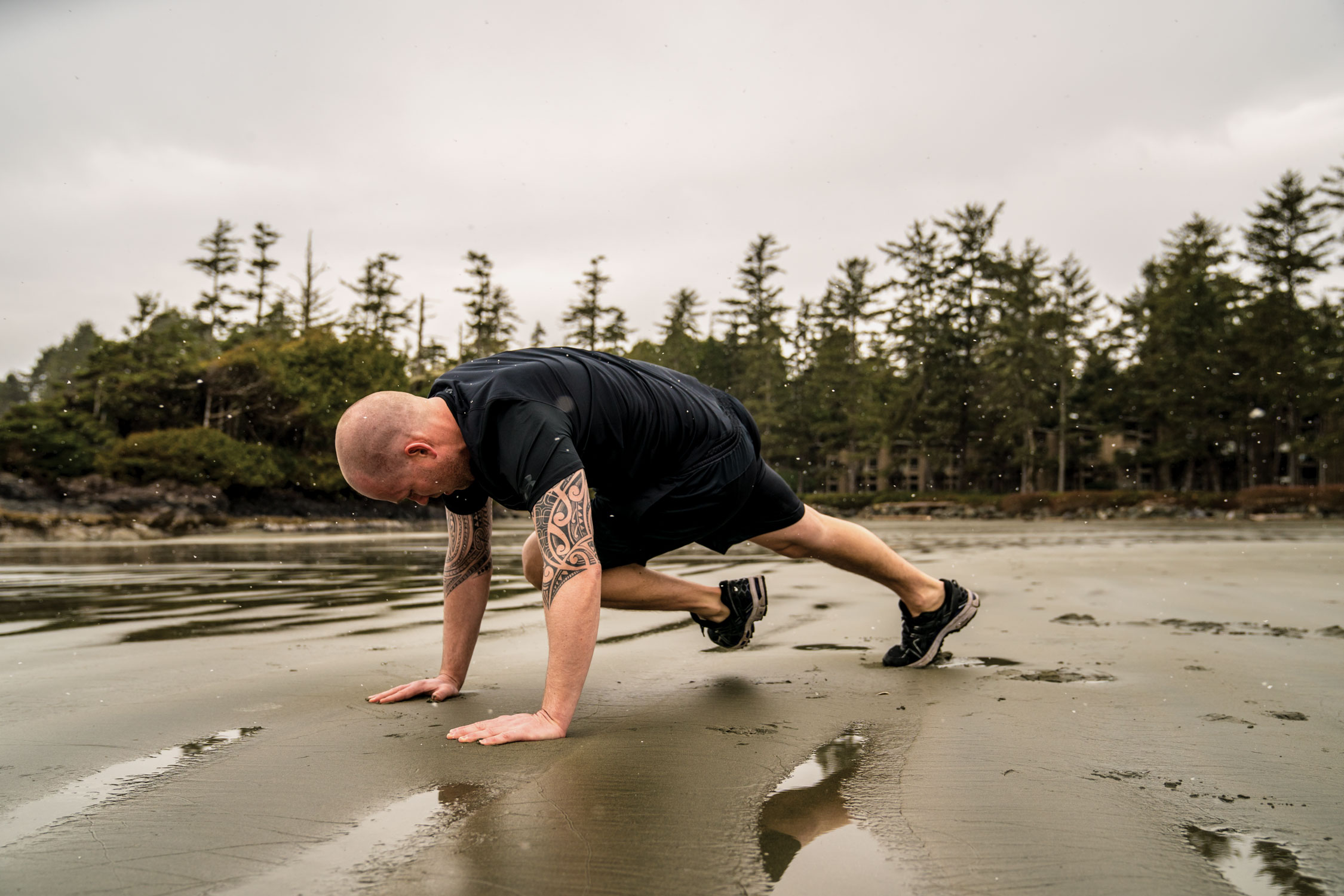 This combo exercise targets your upper body as well as your core. If you’re not yet ready for push-ups on the ground, elevate your upper body by placing your hands on a step, bench, or log.