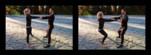- Stand face to face with your partner, roughly a foot away from one another. Each partner’s feet should be roughly shoulder-width apart, with toes slightly turned out.