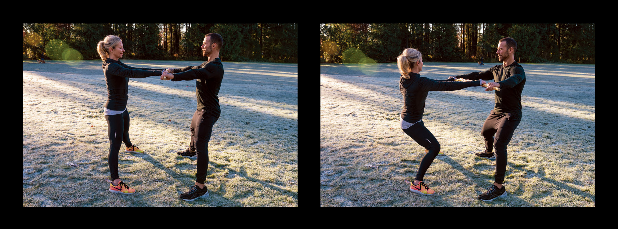 - Lean back against each other’s weight, allowing your arms to relax and straighten, then squat down as low as you can.