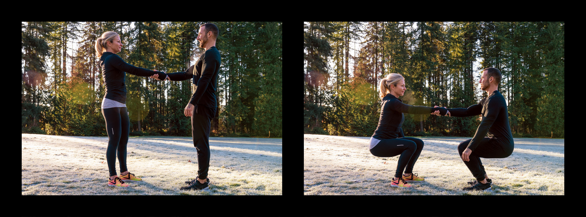 - Stand back up, and as you near the top, switch to clasping left hands.