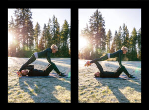 - One partner will start, lying on their back, with knees bent and feet flat on the ground.