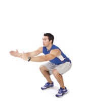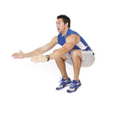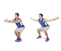 Jump squats Stand with your feet hip-width apart, core engaged. Squat rearward, pressing the bum back and tracking the knees with the toes. As you come up and out of the squat, propel yourself upward, jumping in the air. Land softly back on your feet and immediately do another squat jump. Do not rest! |