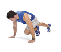 Mountain climbers Position yourself on the floor in a full straight-arm plank, balancing on your toes and hands. Keep your shoulders over your hands and your spine neutral. Step around to your left side with your left foot. Keep the bum down; plant the left foot close to the left hand. Step back and perform with the right leg. Go as fast as you can. |