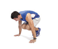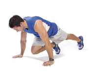 Squat thrusts In a full plank position, with straight arms and balancing on your toes and hands, quickly jump both knees in toward your chest, aiming for feet landing between your hands, and back out again. Continue without stopping. |