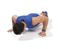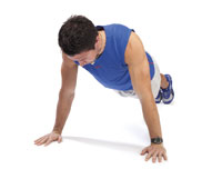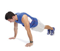 Push-up Keep your hands wider apart than your shoulders and your core engaged. Either do a traditional push-up from the toes, a modified push-up from the knees, or an advanced push-up with your hands on an upside-down BOSU ball or on a wobble board. |