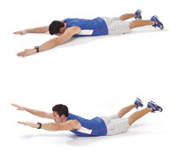 Supermans Lie face down on a mat with your arms extended above your head. Keeping your chin tucked in, lift your upper and lower body up and off the mat. Pause, then slowly lower. |