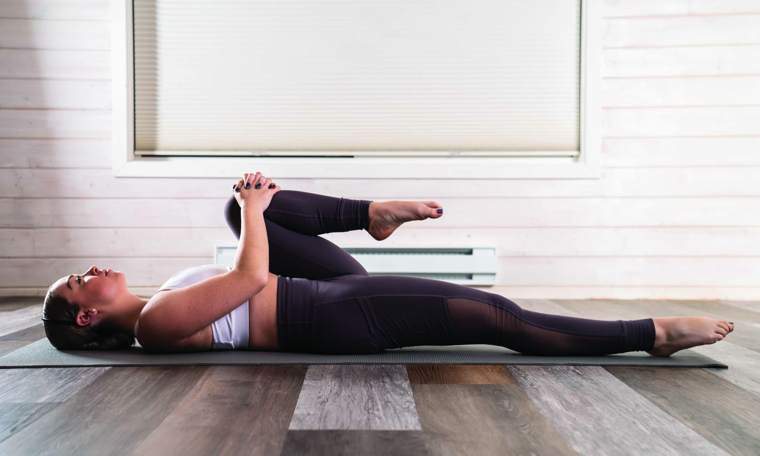 As the name suggests, this pose is great for relieving wind or energizing a sluggish digestive system. Lying on your back, extend the right leg along the ground and draw the left knee into your chest. Hold for a few breaths, then swap to the other side.