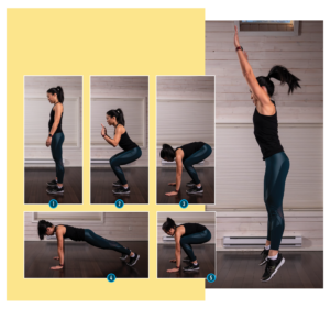 - Jump back softly and land in a plank position, keeping body straight and core tight.