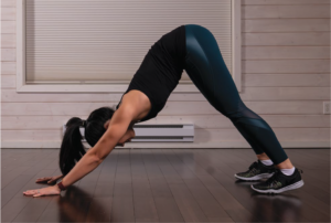 - Lift your knees off the floor and press your hips toward the ceiling while drawing your heels down toward the floor.