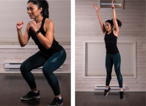 - Lower your body into a squat by pushing your hips back and bending your knees.