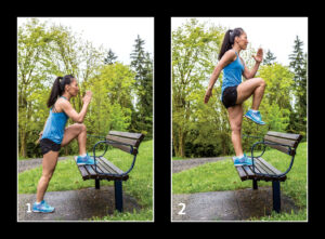 - Using a sturdy chair, or a bench, step on the chair/bench with your left foot. Step and drive the right knee up toward the chest and place the right foot on the platform next to the left.