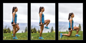 - Holding onto a heavy dumbbell in each hand, take a large stride forward and lower yourself down toward the ground so your front knee is at 90 degrees and your back knee is almost touching the ground. Don’t let your knee go forward beyond your toes as you come down.