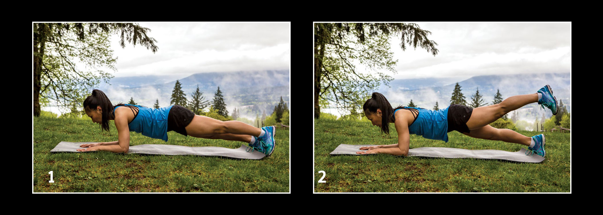 - In a forearm plank, slowly lift and lower the left leg up and down for 15 reps.