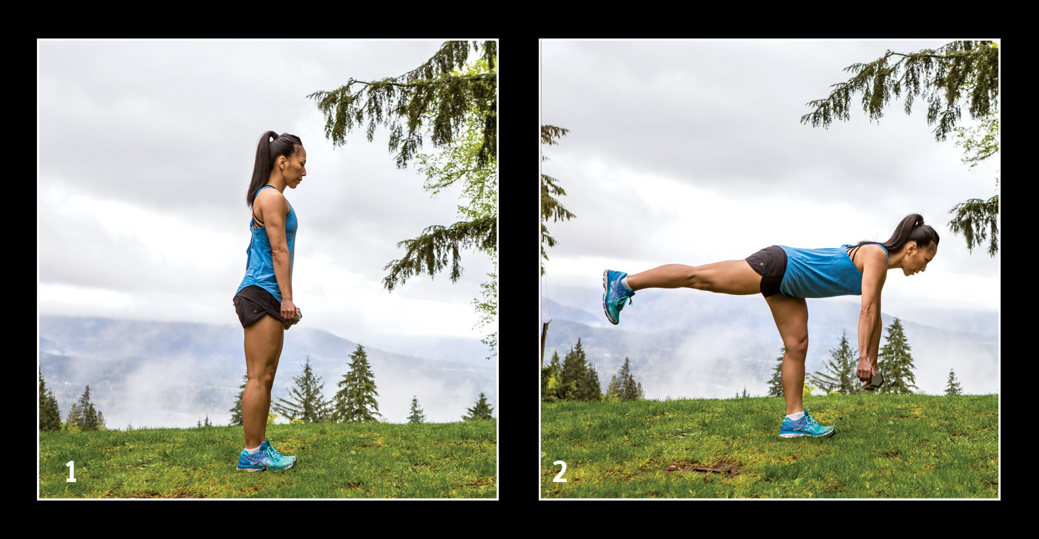 - Holding onto a heavy dumbbell in your left hand, lift the right leg straight behind you and allow your hip to hinge forward and lower your upper body.