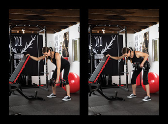 - Holding a dumbbell in one hand, hinge your hips back, bend your knees, and place your other hand on the end of a bench.