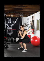- Keeping your chest up and your back flat, hinge your hips back and down, bending your knees so your thighs are parallel to the floor. Keeping your knees in line with your toes, press into the floor with your feet to return to standing.