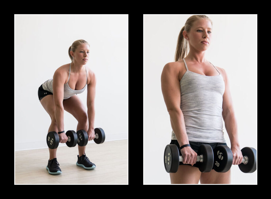 • Once the dumbbells reach halfway down your shins, press through your heels, focusing on using your hamstrings and glutes to pull yourself back up to the start position.