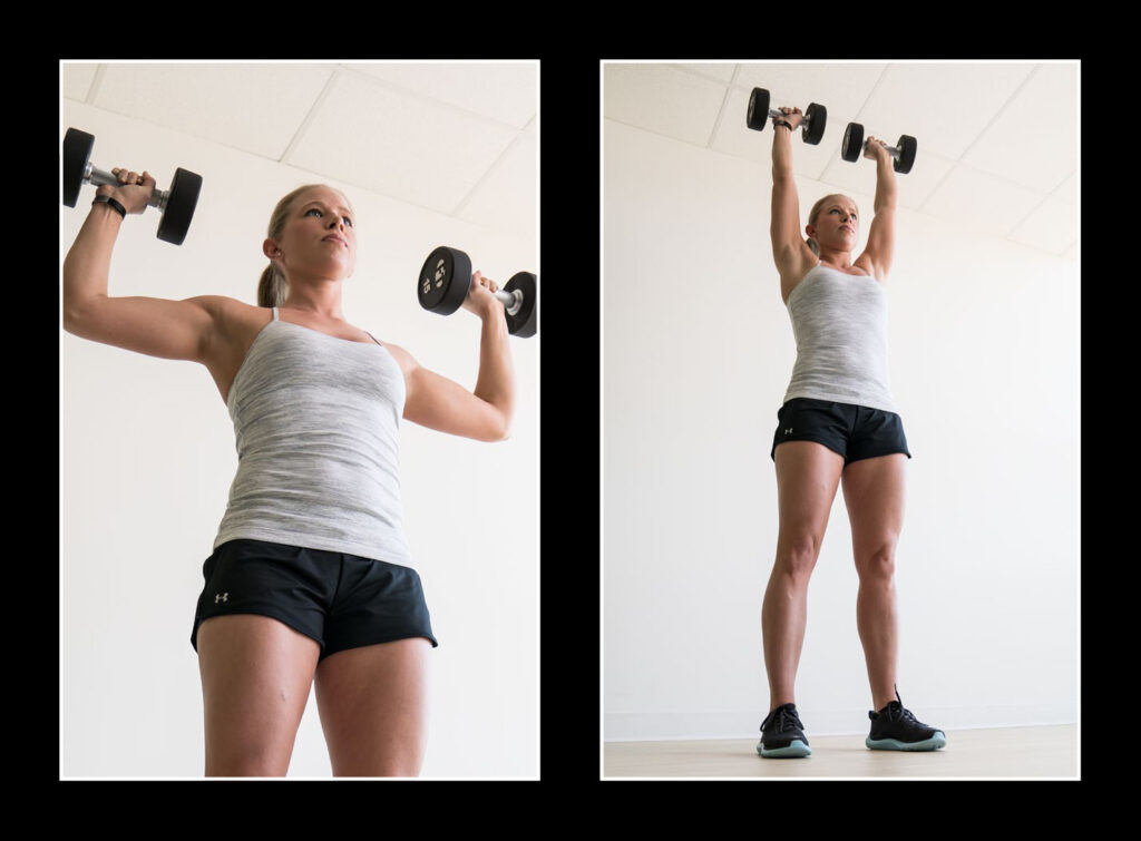 • Press the dumbbells overhead until your arms are extended and the dumbbells are almost touching. Lower with control, and repeat for reps.