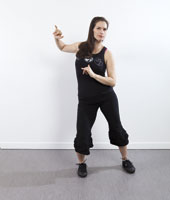 ![]() 3. Cumbia MacheteBring your right foot forward, tap centre, and step back while your left arm reaches up and down in a chopping action. |