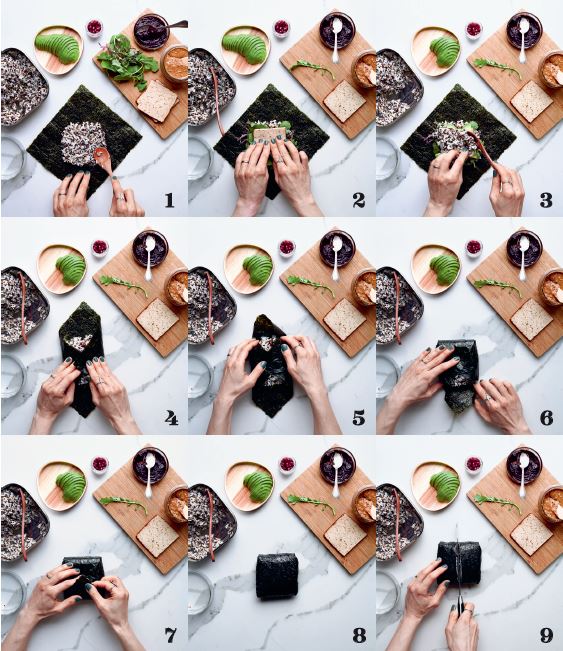 Imagine wrapping a birthday gift. Pull left and right nori corners together and overlap them with filling safe inside (image 4). If you’re using warm rice, it should be enough to glue the nori corners together, but if not, wet your hands. Do the same with top and bottom corners (image 5), tucking folded corners in to make sure that no rice peeks out (images 6 and 7). Flip onigirazu over and let it rest a few minutes on work surface for warm rice/water to glue nori together (image 8).