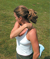 Take hold of your right upper trapezius muscle with your left hand and hang on. At the same time, look down at the floor past your left hip. The muscle will try to slip away, but if you can hang on to it not too hard, though you should feel a good stretch. Hold it for five deep breaths and repeat on the other side.