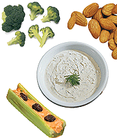 With the abundance of commercially processed, high sugar and brightly coloured foods available, it can be hard to teach kids about more natural, satisfying options. When preparing healthy snacks it’s key to consider nutritional value along with fun presentation. Children actually need good quality fats for cell growth, metabolism and brain development. They also need good quality protein for growth and immunity. Keeping this in mind, “build” snacks that are more complex, that feature natural carbohydrates, proteins, and essential fatty acids found in nuts, seeds, and natural oils. Instead of having a simple piece of fruit, combine it with nut butter or a yogurt or tofu dip. Homemade fruit and nut muffins served with nut butter can also be convenient. Commercial peanut butters often have hydrogenated fats so switch to high calcium almond butter or other nut butter blends. A classic favourite that follows the rule of having a fruit or vegetable combined with protein and fat is “mosquitoes on a log” where celery stalks are filled with nut butter and raisins are pressed into the nut butter. These more “complex” snacks provide more satisfaction and make for a longer-running fuel source.