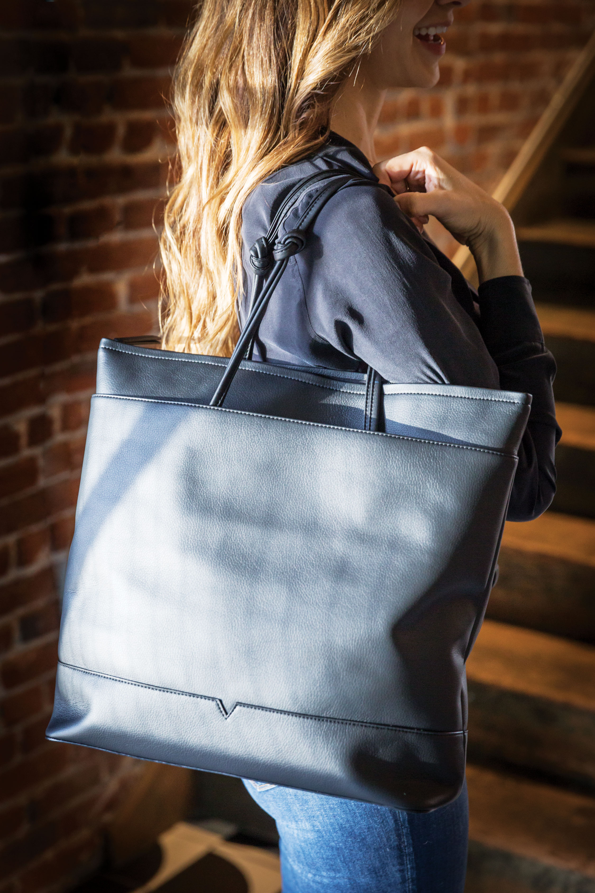 The new material is vegan. It’s lighter than leather. It’s also stain-, water- and scratch-resistant, which “gives you the freedom to live your life,” says von Holzhausen. “So you can look really chic and cool and not worry when your bag gets dirty.”