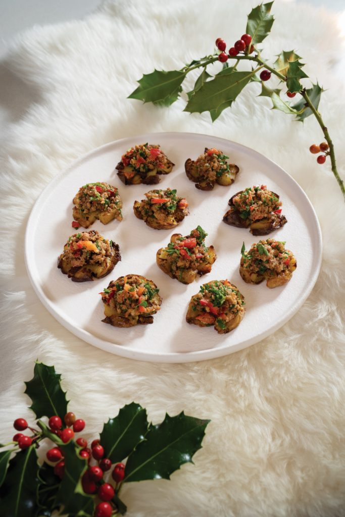 Smashed Potatoes with Walnut and Red Pepper Salsa