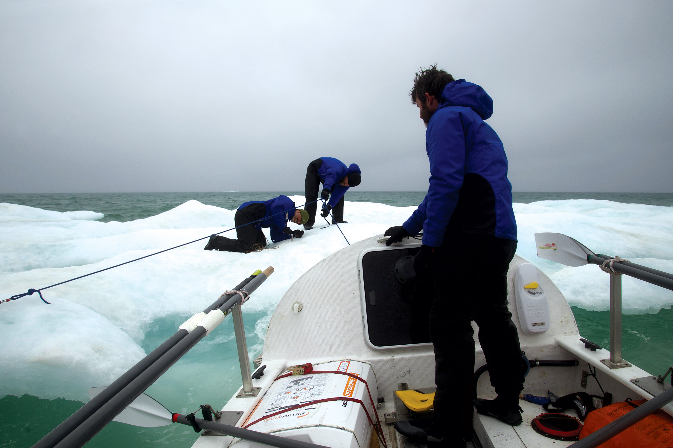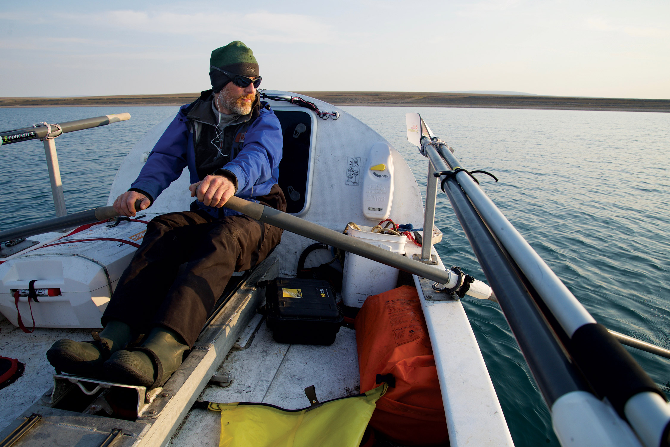 It’s July 31, 2013, as Frank Wolf and I are rowing our four-person ocean rowing boat, the Arctic Joule, through the waters of the Amundsen Gulf on the Northwest Passage. Our teammates, Paul Gleeson and Denis Barnett, are resting in the stern cabin awaiting their turn on the oars. The visibility is a mere fifty yards, but we’re forced to travel solely by the aid of GPS and compass. We know we’re close to the cape from the steady thump of waves against cliff, but we see nothing.