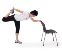 - Holding onto the back of a chair with your left arm, bring your right foot up toward your bum and hold onto it with your right hand.